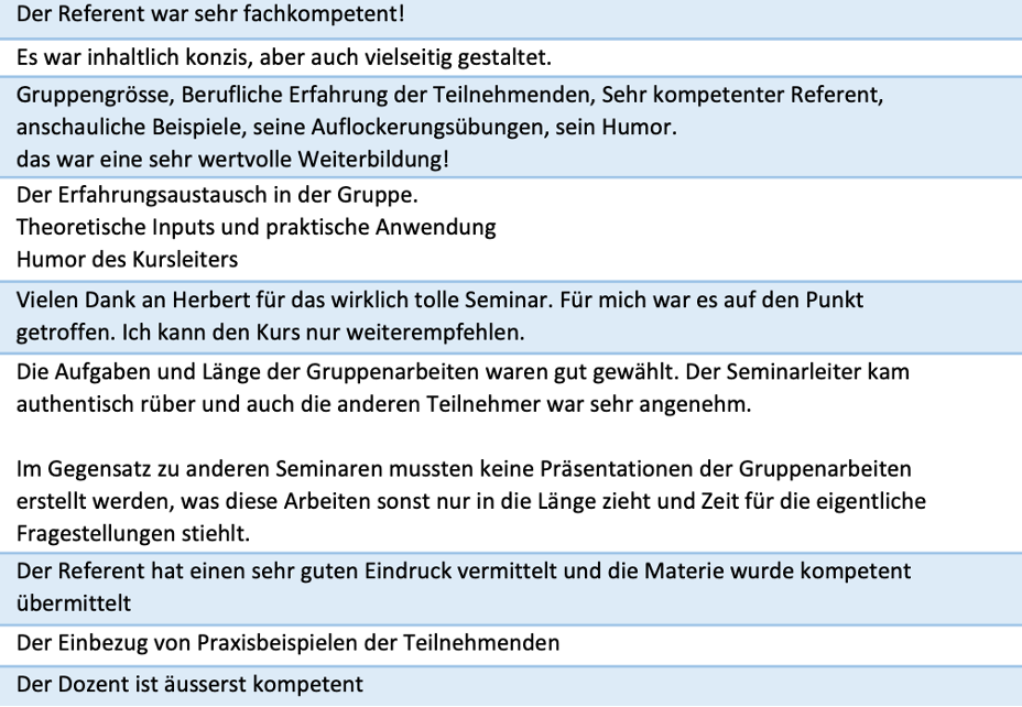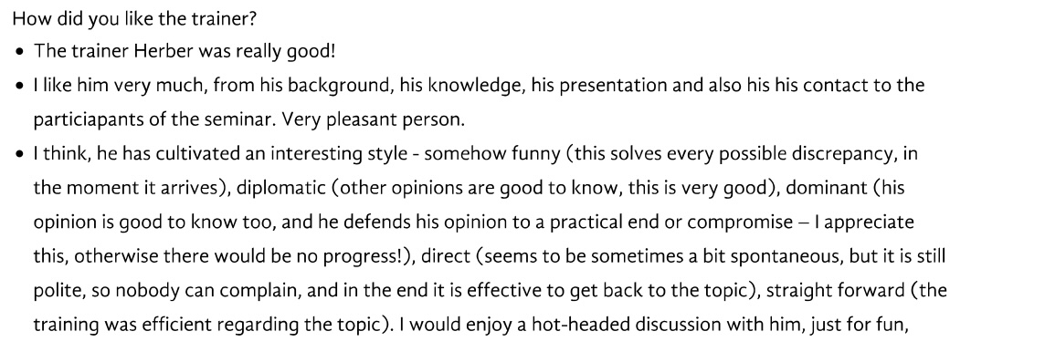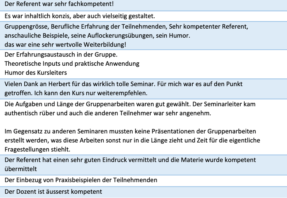 „Der Dozent, Herbert Salzmann, erscheint mir als eine wirkliche Kapazität auf dem Gebiet Kommunikation, Führung etc. Ich darf feststellen, dass ich noch selten ein solch kurzweiliges und praxisbezogenes Seminar besucht habe.“