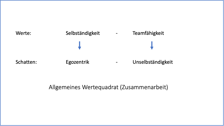 Um den Daseinsforderungen zu entsprechen, so Schulz von Thun „kann jeder Wert“ (Tugend, Leitprinzip, Stärke, Persönlichkeitsmerkmal) „nur dann zu einer konstruktiven Wirkung gelangen, wenn er sich in einer ausgehaltenen Spannung zu einem positiven Gegenwert befindet („Schwestertugend“).“ (Schulz v. Thun, Miteinander Reden, Bd. II, S.38) Hier ein Wertequadrat aus dem Bereich der Mitarbeiterführung zur Veranschaulichung:
